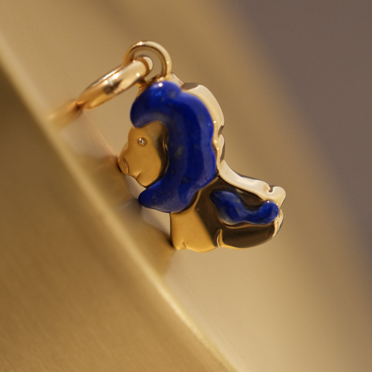 Fein gearbeiteter Anhänger aus poliertem Gold in Form eines stilisierten Löwen, akzentuiert mit intensiv blauem Lapislazuli. Das plastische Design und die harmonische Farbgebung verleihen dem Schmuckstück einen ausdrucksstarken, zugleich eleganten Charakter. Ein besonderes Accessoire für Liebhaber außergewöhnlicher Tiermotive und hochwertiger Juwelierkunst.