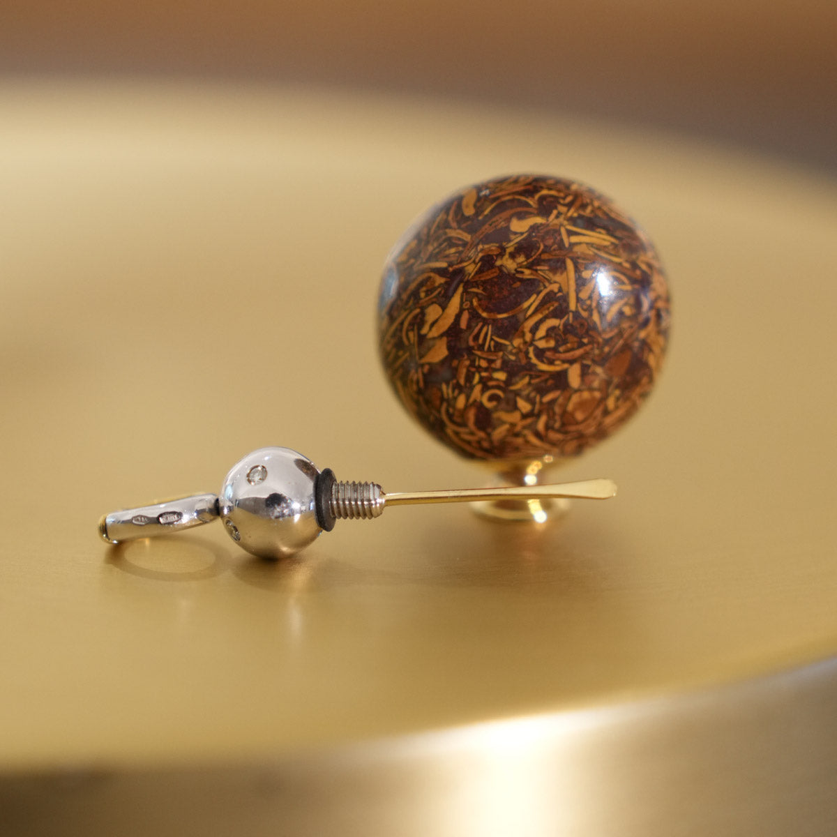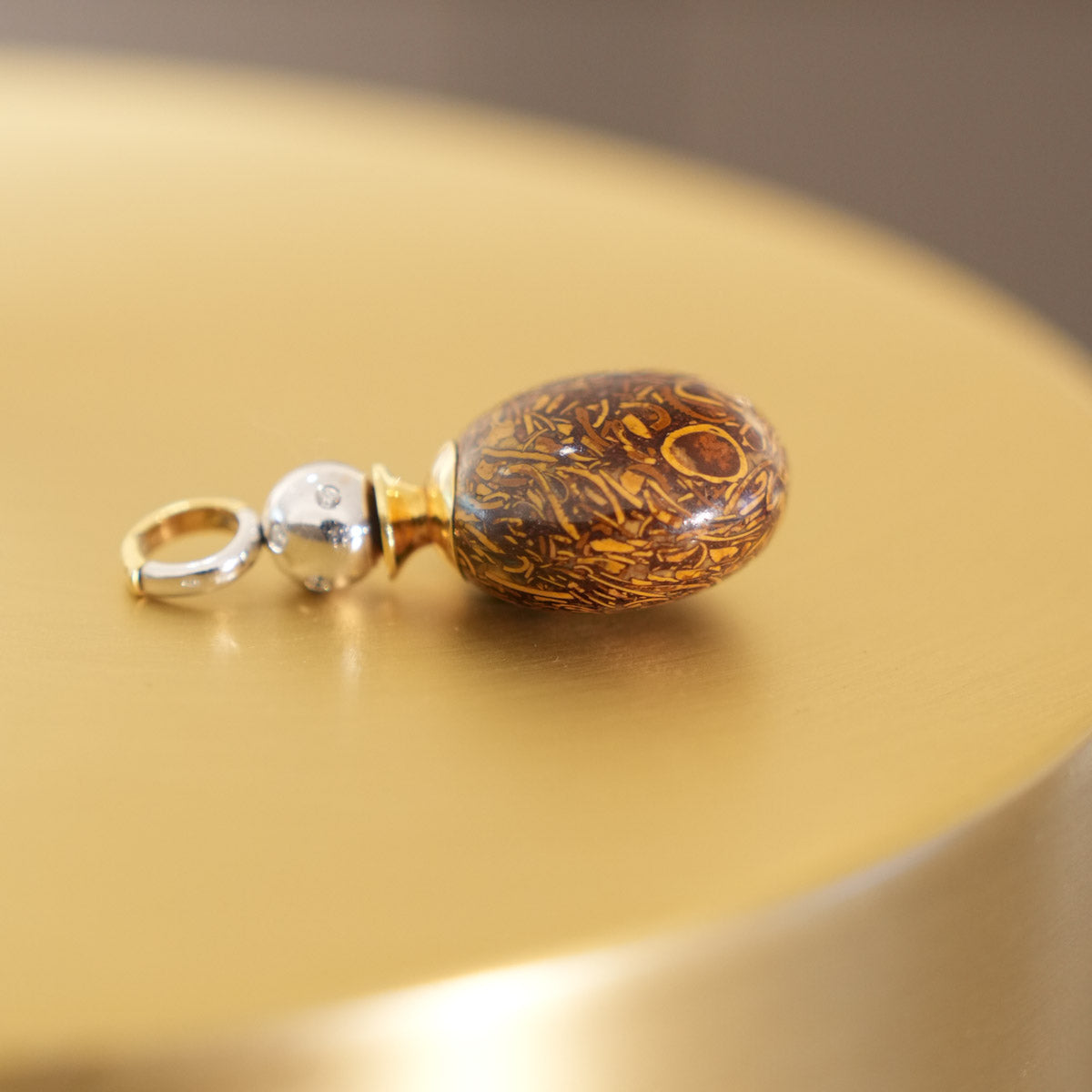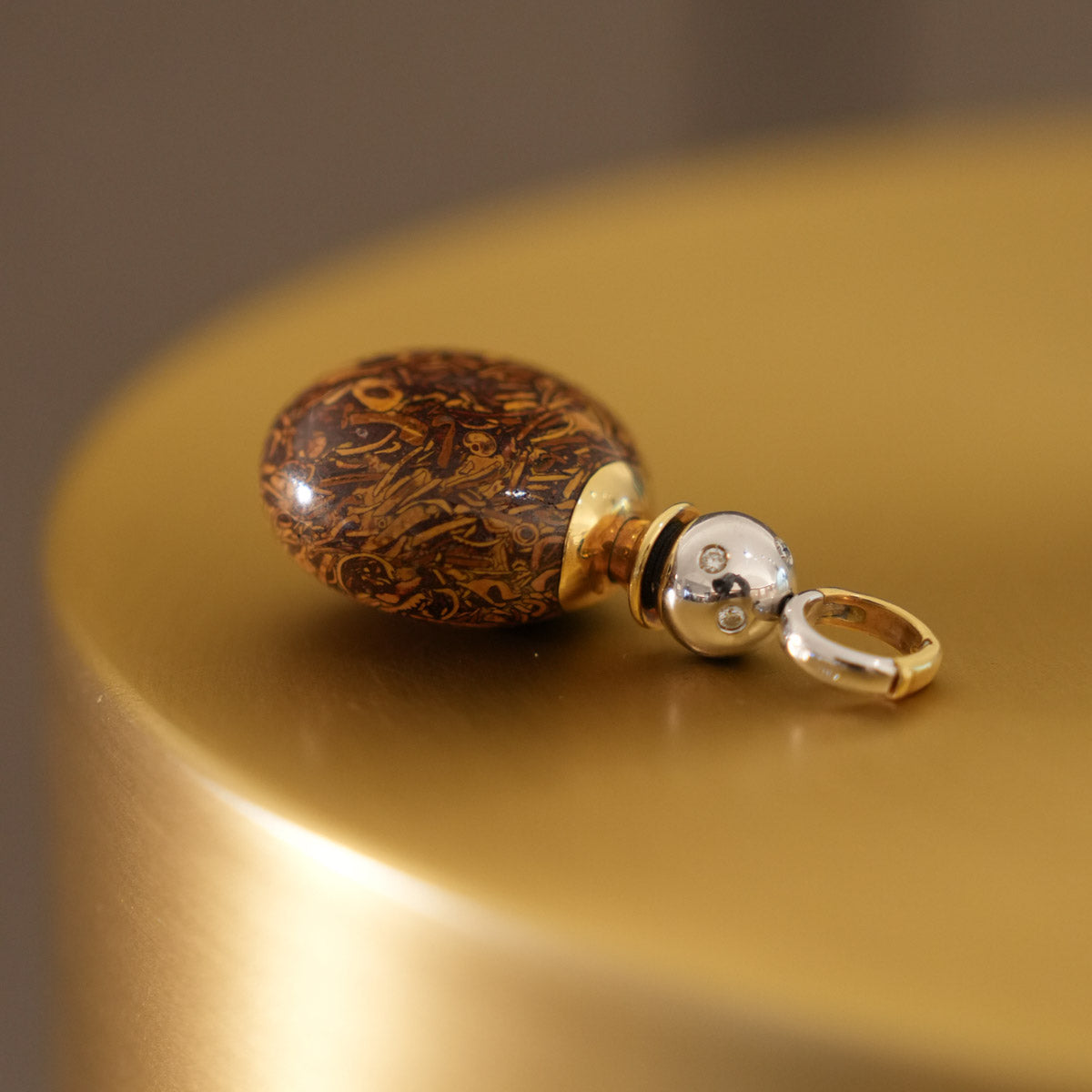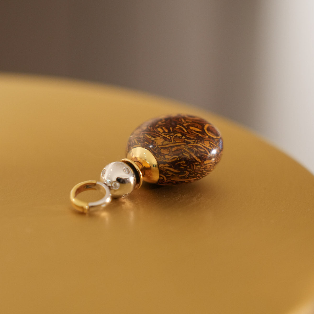 Eleganter Parfum-Flakon-Anhänger mit ovalem Korpus aus hochwertigem Bildjaspis in warmen Braun- und Goldtönen, dessen natürliche Maserung an Landschaftsmotive erinnert und jedes Stück zu einem Unikat macht. Gefasst in poliertem Gold und ergänzt durch einen edel gestalteten Verschluss mit dezenten Diamantakzenten, vereint dieses Schmuckstück Funktionalität mit luxuriöser Ästhetik. Ideal für Liebhaber außergewöhnlicher Vintage- und Sammlerstücke.